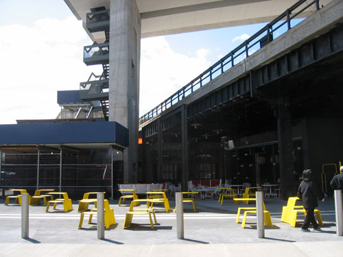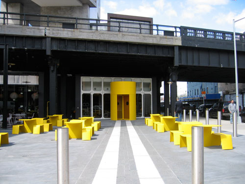 Plaza and entry to hotel lobby tucked beneath the High Line.