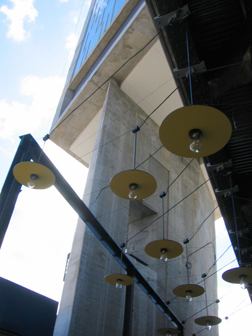 Lighting strung over patio area beneath the High Line adjacent to the lobby.
