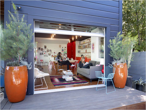 Claire’s studio is rendered plainly, but chromatically. Orange laminate cabinetry, pink powder-coated off-the-shelf shelf brackets, a deep purple ceiling and blood-red bathroom emerged from a color palate that Claire has given us within the first week of working. Worthwood end-grain plywood flooring extends through the space, lending a raw studio feel. An aluminum and glass garage door opens up the back sitting area to a rear deck and the Palm Springs-inspired garden design by Flora Grubb.