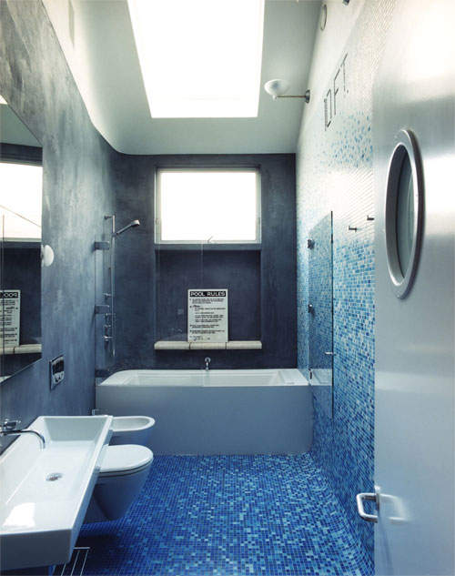 The bathroom disorients as it throws you to the bottom of a swimming pool. The room recreates one of Claire and Jay’s favorite feelings: dropping in and out of an emptied pool on skateboards. A Bisazza mosaic tile wall wraps to the floor while a white plaster warped ceiling surface is used as a towering reflecting plane. Plumbing fixtures plainly mount on the sinuous wall of gray shower stucco. Concrete pool coping creates a deep shelf for shower potions.