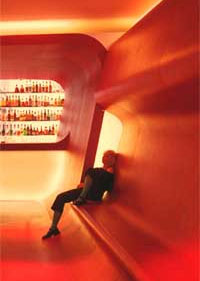 The interior of Denari-esque undulating planes was designed to fit into the shell of the new building designed by another architect. Continuous surfaces (where floors wrap up to become walls, seating areas, beds, counters and ceilings) are used throughout the hotel providing a "cocoonlike" effect.