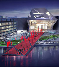 Her design features a striking composition of a red "carpet" extending from the theatre into and over the dock crossed by a lush green "carpet" of paving with lawns and vegetation. The red “carpet” will be made of bright red resin-glass paving covered with red glowing angled light sticks. The green "carpet" of polygon-shaped planters will offer ample seating and will connect the new hotel to the office development across the square. The planters will feature marsh vegetation to soften the space and to act as a reminder of the historic wetland nature of the site. These will bring colour and variety to the space and act as a setting for the new buildings.