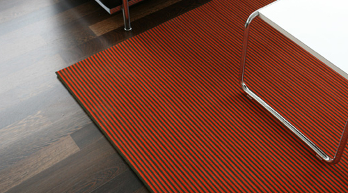 This thin-striped area rug from Ruckstuhl is made from 100% pure wool and is available with black and heather or forest and persimmon stripes.