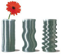 "This anodized aluminum vase is encased within a galvanized steel coil, so the outside can be reshaped to your heart's content. 8.5" h x 3.5". Made in Brooklyn."