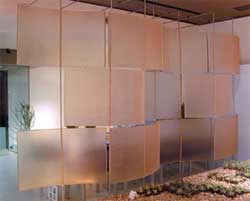 The Troika from em is a screen / partition wall constructed from translucent resin panels and spheres along with stainless steel rods, plates, and collars. Depending on your installation, the Troika is available with or without the self-supporting frame.
