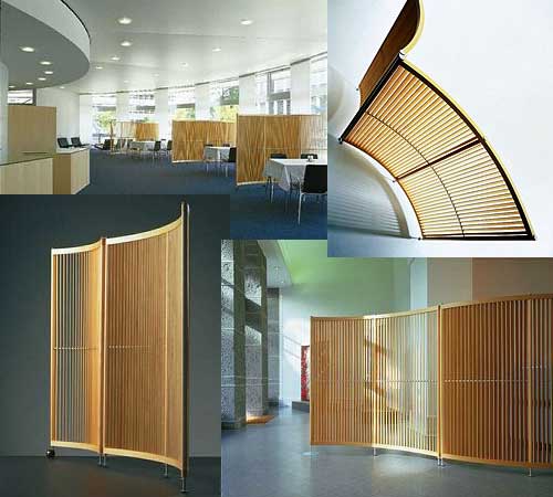 The units are composed of oblique slats in natural beech and maple. The large units may stand alone on plate feet.