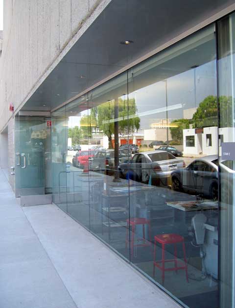 Street front openings cut into the concrete shell
