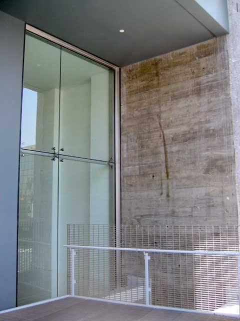 The building is known as the Wind Tunnel because it once housed the largest testing wind tunnel on the west coast. Los Angeles architects Daly Genik have done a marvelous job weaving together this hodgepodge complex of concrete buildings. The biggest design move is the placement of three large skylight structures on the roof which allow daylight to penetrate deep into the building. The skylights are "clad in layered lightweight high-tech plastic" and are a sculptural feature of the roof top garden.