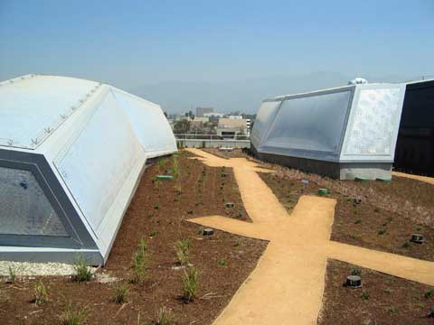 Designed by Nancy Goslee Power and Associates, the roof has just been planted with drought tolerant and native selections. A series of decomposed granite paths weave around the skylight structures.
