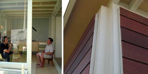 Edgar Blazona being interviewed inside one of his modular structures, and a detail of the exterior finish (right).