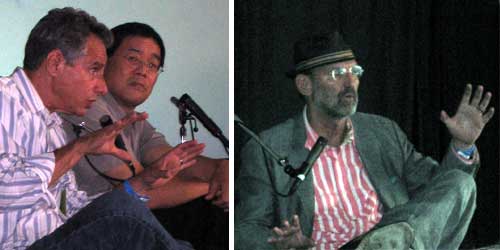 The "Fireside Chat" was scheduled to be with big gun architects Eric Owen Moss (director of SCI-Arc) and Thom Mayne, but the late running schedule would have bumped Futung Cheng, so the discussion became a threesome. The conversation meandered around politics, working at different scales and what it meant to each designer to express themselves through their work. To sum it up simplistically: Mayne spoke a lot about "exposing himself" through his work while Moss repeated that he wanted to work on "an enormous scale." Sounds kinda funny put like that. ;-)