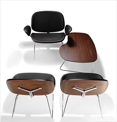 Lounge armchair with tubular chrome steel frame. Plywood seat and back in beech plywood, oak, maple, wenge, rosewood, birch or mahogany wood with frontal upholstering and covering in soft leather or fabric.