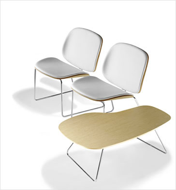 Coffee table with tubular chromed steel frame. Table top in veneered plywood as per wood finishing sample book.