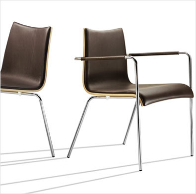 Lounge chair/armchair with tubular steel frame, chromed or silver painted. Shell in veneered plywood as per wood finishing sample book. Front shell upholstered and covered with fabric or leather as per sample book. Armrests can be covered with soft leather.