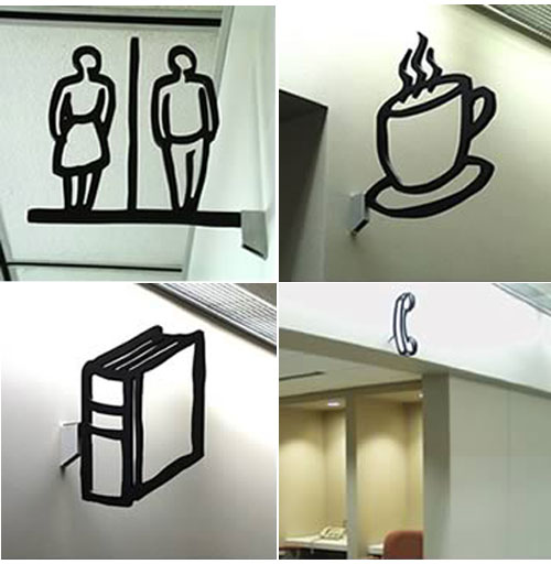 "Need the bathroom? Gotta check your voicemail? Time for a caffeine fix, pronto? Life's minor emergencies call for signage that speaks loud and clear, in any language. Out of the ordinary yet obvious, our highly visible 3-D signage brings a sense of order to your work environment, all with a creative spin and whimsical touch. Our icon based signs are made of flame retardent, high-density black PVC. Installation is accomplished lickety-split, thanks to brushed aluminum brackets that require just two screws."Link: Wheresthebathroom.com