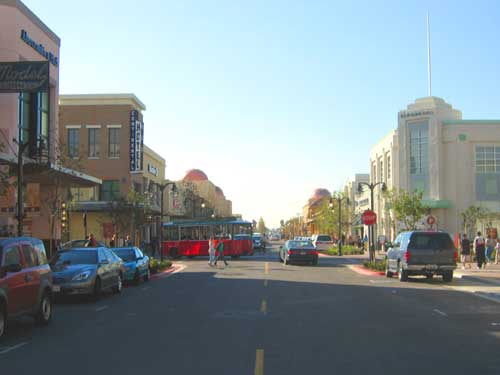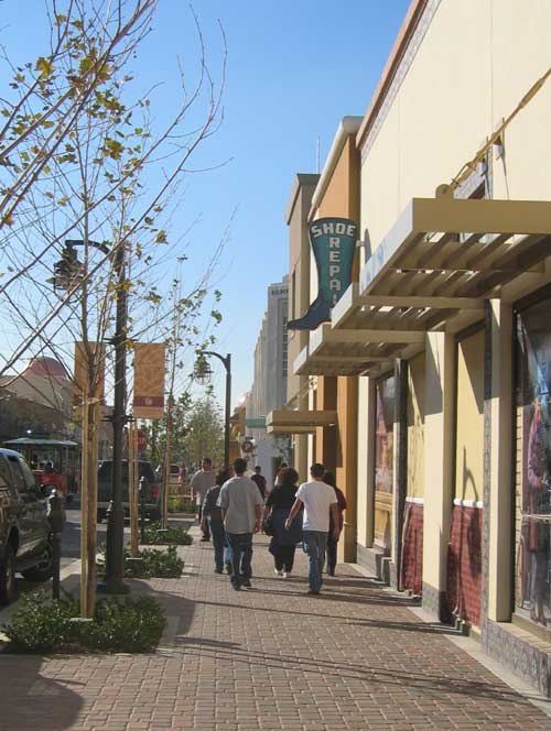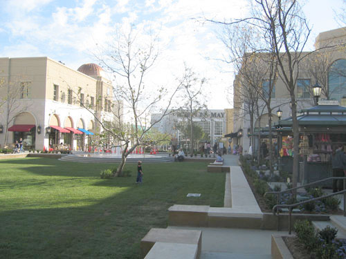 The New York Times saw fit to cover the opening of this new mall, so we figured that it was worth the 40 minute drive to check it out. City planners had originally envisioned a more traditional mall, but the developers had a bold idea that breaks many (though not all) of the rules of the typical mall development. The idea behind Victoria Gardens is not new, pseudo-historic town centers are the core of most New Urbanist neighborhoods, but here it has been inserted into an existing tract home city.