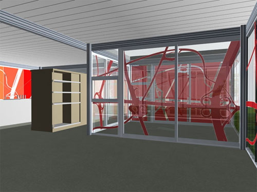 The kit includes radiant heat "smart floor," Bosch aluminum structure, insulated glass walls, plywood laminate cabinets, Bulthaup Kitchen workbench and accessories, insulated steel roof, solar power assistance, and 3M graphic vinyl outFiTs (described below).