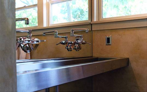 The entire bathroom is conceived as one continuous space, rather than little compartments. The floor surface is open and uninterrupted thanks to the wall mounted sink and toilet. Custom designed stainless steel fixtures include towel bars and shelves, and the large trough sink which is hung in front of the mirror wall and features two double-jointed kitchen faucets.