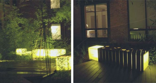 In contrast to the regularity of the existing structure, the landscape architects employed a concept of fragmentation; in the plantings, pathways, materials, topographic undulation, etc. Groovy lighting elements transform the space at night with a yellow green glow emanating from the benches and a fiber optic web amongst the bamboo. The design provides an stylish contemporary foil to the historic building.