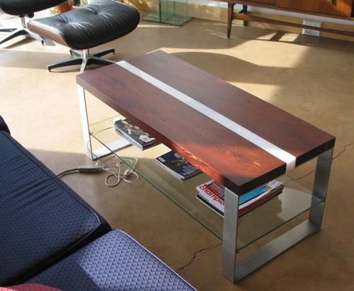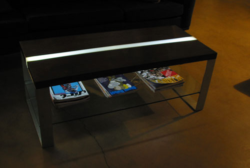 "I've been toying with the concept of lighted furniture for a while now. I like the idea of creating small discreet sources of low light scattered around a room and using point sources where more illumination is needed (i.e. for reading). One method of doing that is embedding lights within furniture. In the case of this table the light is provided by two 1W LED's. It shines both up and down. The light up is very pretty, but not particularly useful (you can't read by it). The light down illuminates the bottom shelf, in our case the home of our stack of current magazines."Another cool thing on his site is the house he's