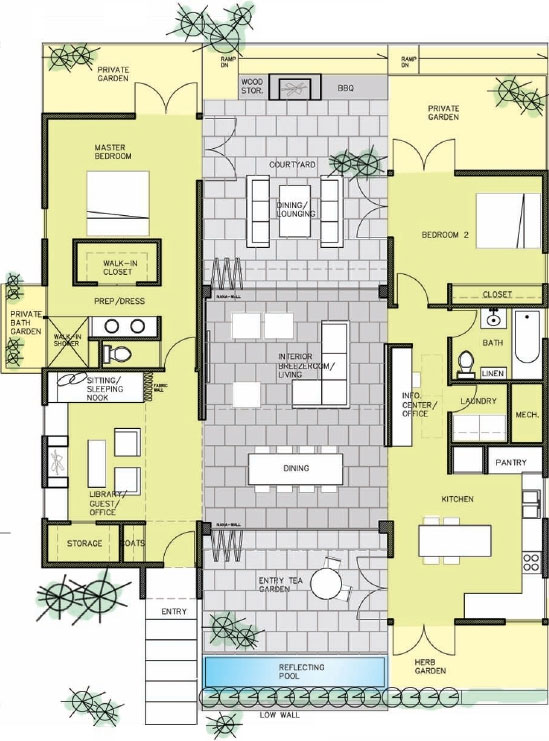 The BreezehouseTM is a 2 bedroom, 2 bathroom, 1,798 square foot modular home with an optional 248 square foot third bedroom module. The house is organized around a light-filled central space called the Breezeroom which is opens to outdoor living spaces at each end and is topped by butterfly roof.