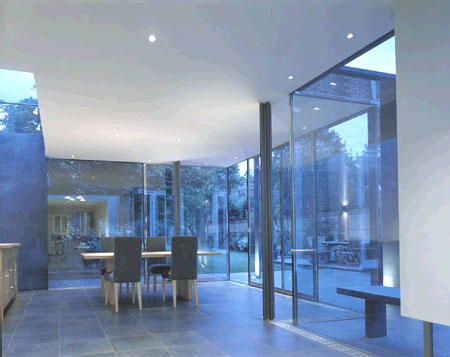 The existing kitchen was remodeled and expanded outward to include new dining and living areas within the bronze and glass Miesean pavilion. The concept is of a repeatedly folded plane of bronze which defines the space and frames views of the garden. Two of the glazed walls can be opened completely to create a seamless indoor/outdoor space.