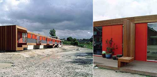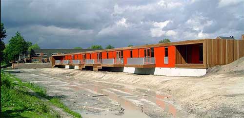 "Onix was requested by the Woonconcept Foundation to design approximately 14 patio bungalows for a small section of the Krakeel neighborhood in Hoogeveen. The houses are situated in a green zone that meanders through the suburb, consisting of an attractive green avenue, school facilities, ponds, a children’s farm, playing fields etc. An autonomous construction, the building forms a spatial jetty consists of private terraces, verandas, privacy screens, stages, a car port, end facades, roofs, a communal terrace, and an entrance gate to the inner area."