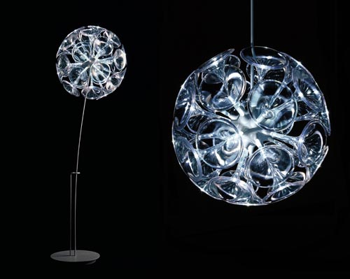 Dandelion: "The luminaire draws inspiration from dandelions gently swaying in the wind. High efficiency LEDs illuminate transparent flutes. Dandelion is ideal for lighting and characterizing spaces that require decorative solutions: showrooms, stores and homes. It is available in floor lamp and hanging lamp versions."