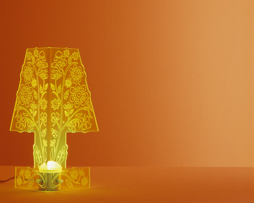 Primavera: "The shape of the lamp is given by its own light, which also defines the relationship with the surrounding space. A 3 Watt LED illuminates the Plexiglas. The carved floral motifs, and the colored backlit diffuser create a weightless, amusing table lamp."