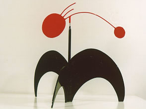 What sets her apart from most of the post-Calder crowd is a flair for composition. Her linear elements do more than just hold planes in space, as so often happens with mobiles. She incorporates line as an integral gesture, signaling motion even in static work. While some of her work falls into the category of pure abstraction derived from the play of balanced forces of motion, the most interesting pieces are those which readily display her fascination with forms as they occur in the natural environment.