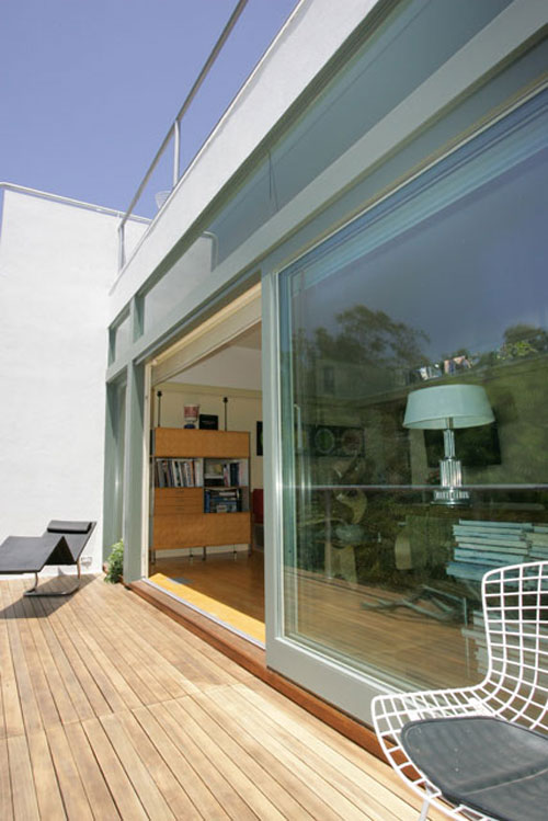 (CLOCKWISE STARTING AT TOP LEFT) WOOD CEILING OF CARPORT; DETAIL OF WALL AND RAILING FROM REAR DECK; LOOKING DOWN AT DRIVEWAY FROM ROOF TERRACE; DETAIL OF ROOF TERRACE STAIRWAY