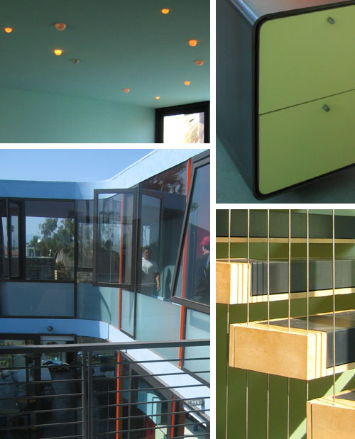 Located on one of the Venice canals on a 30' x 95' lot, the house is a modernist grid of steel, glass and brightly colored planes. The house is painted mainly in shades of bright blue offset by lime green, orange, red, blackened steel, natural maple, and polished concrete floors.