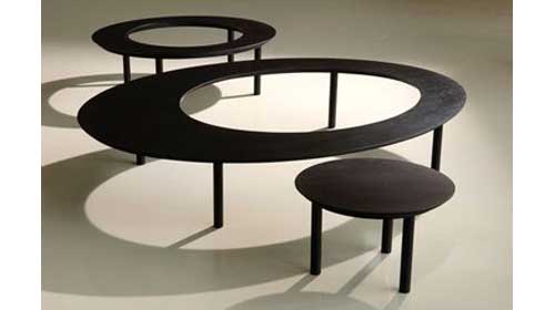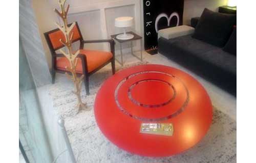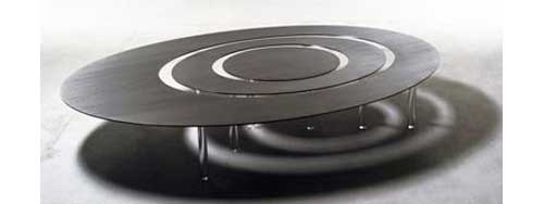 The Raindrops coffee table from cor3 creative works is a sleek table comprised of two rings and a solid center that can be exploded into three separate tables. The table is available in several finishes including steel and plexiglass (detail at right) and a dark wood. A red version is also featured from earlier product displays.