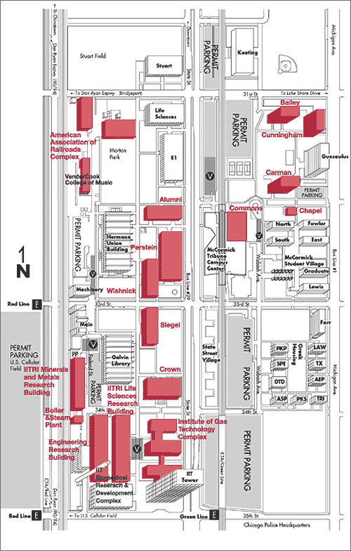 IIT Campus map, Mies designed buildings shown in red