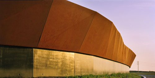 There are two basic wall conditions. The steel Curtain Wall is of concave and convex folded Corten steel produces a gently undulating rusted wave floating on a recessed dark concrete base. In contrast, the translucent Scrim Wall adjacent to residential neighborhoods is composed of patterned acrylic panels and repeated vertical louvers.