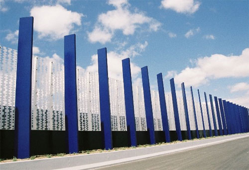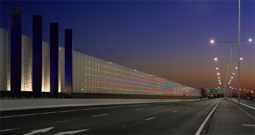 The project includes three series of sculptural sound walls, a pedestrian bridge and design parameters for road bridges, crash barriers and retaining structures, creating a unified roadway to be experienced at freeway speed.