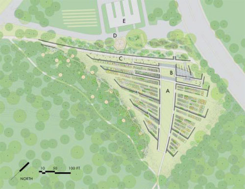 Seen from the vantage point above the garden’s main terrace, the scheme is expansive and directional, with the site’s roughly triangular shape emphasizing an arcing lawn and path that gesture back toward the Arboretum’s open lawns and pervasive canopy trees.