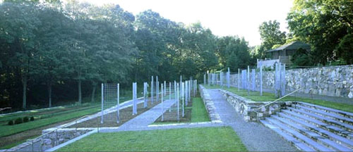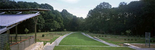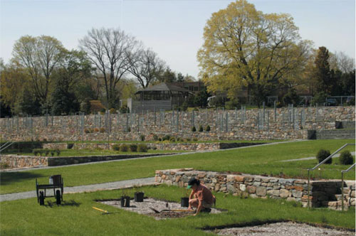The garden site is approximately 4 acres and features an elevation change of nearly 30 feet. A system of non-reinforced three foot thick stone walls were implemented to create a series of garden terraces which provide level ground and an organizational system for horticultural display. The design is evocative of tradition of agricultural landscapes as well as French parterre gardens.