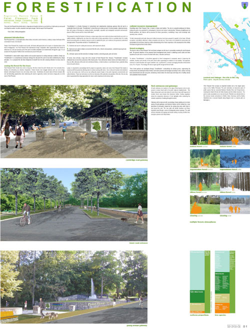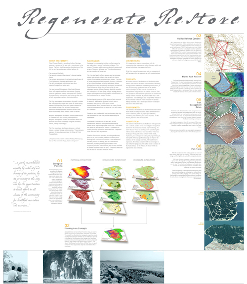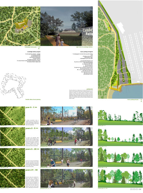 The competition to redesign Point Pleasant Park has been awarded to the firms NIP Paysage, Montreal and Ekistics Planning & Design, Dartmouth. Point Pleasant Park is a park in Halifax, Nova Scotia that has sustained damage in the way of insect infestation, ice storms and Hurricane Juan seriously damaging and degrading their coastal forest. Therefore, it is no surprise that the mandate for the competition was Regenerate, Restore and Renew focusing attention on strengthening coastal ecologies and preserving the unique heritage of the site. The panels themselves are lessons in ecology, detailing 50-year forest management and slope stabilization strategies, combined with native plantings and local materials.