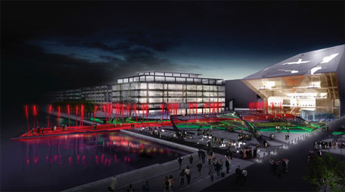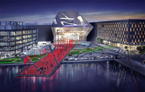 Her design features a striking composition of a red "carpet" extending from the theatre into and over the dock crossed by a lush green "carpet" of paving with lawns and vegetation. The red “carpet” will be made of bright red resin-glass paving covered with red glowing angled light sticks. The green "carpet" of polygon-shaped planters will offer ample seating and will connect the new hotel to the office development across the square. The planters will feature marsh vegetation to soften the space and to act as a reminder of the historic wetland nature of the site. These will bring colour and variety to the space and act as a setting for the new buildings.Link: Dublin Docklands Development Authority