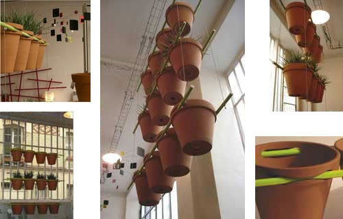 The pots are grouped via steel bars which slot into slices on each side. The steel bar and wire suspension system allows eight or twelve pots create a vegetable wall. Might create a mess when you water... but whatever. Single pots are also available in a non-hanging version.