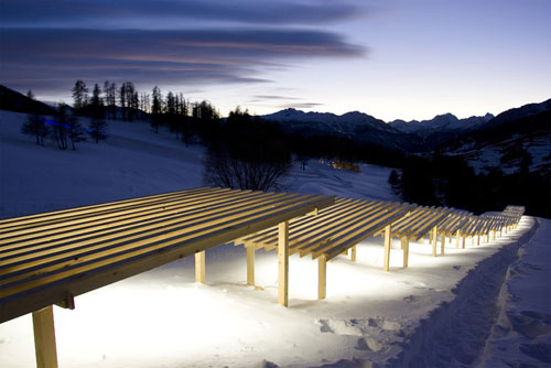 Investigating and bridging art and architecture, the Snow Show pairs artists and architects together to create ephemeral works from snow and ice. This year's show explores a more southern latitude and environment from previous incarnations of the snow show, and folds athletic competition into the design considerations. Indeed the entry by Carsten Höller with Tod Williams and Billie Tsien takes this notion to the limit with their participatory design.