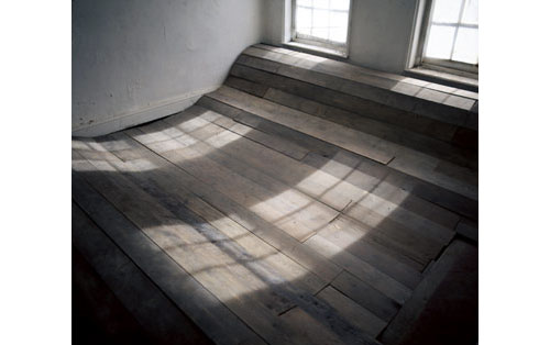 London based artist Joanna Sands bridges the realms of art and architecture by creating contextual sculptures which challenge and inform the perception of space. She began making large temporary sculptural installations in abandoned buildings in 1993, often using found materials. The use of dilapidated structures as a canvas brings to mind the work of Gordon Matta-Clark - the appropriation and investigation of cast off places. By making visually simple alterations to found spaces, Joanna subverts the spatial expectations of the viewer. These early pieces were ephemeral: constructed, documented, experienced as the venue for a "viewing" party, and then dismantled.