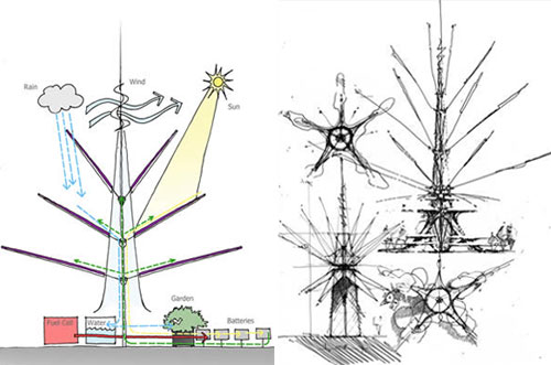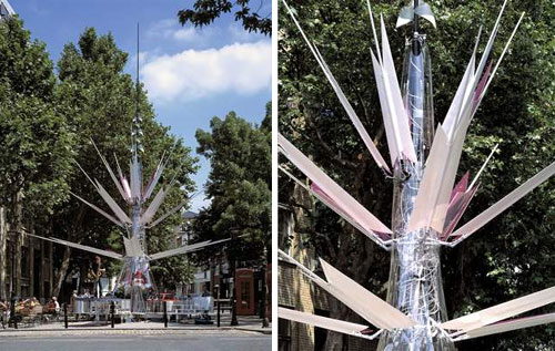 Nothing to do with the UK national treasure... the London Oasis is a temporary structure on Clerkenwell Green installed as part of national Architecture Week. It is a kinetic sculpture by architect Laurie Chetwood designed to demonstrate sustainability and renewable energy while providing entertainment, a place for meeting and tranquil space for Londoners. Self-sufficiently powered by solar cells, a hydrogen fuel cell and wind, the Oasis interacts with the environment around it. Shade providing "branches" open and close in response to the weather. Enclosed pods at the base provide a place of seclusion for people to rest with "cleaner cooled air and relaxing sounds." At night the Oasis acts as a beacon in the cityscape with lights which repsond to the movements of people around it. It even uses rainwater it has collected for irrigation and cooling.