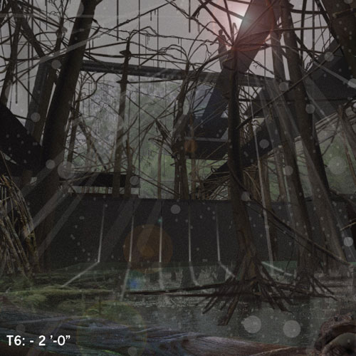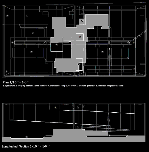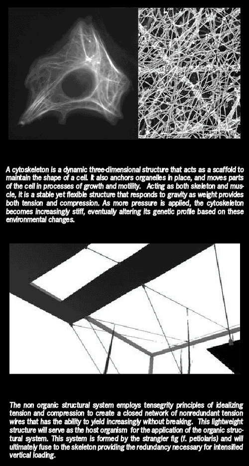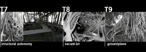 The proposal by David Fletcher + Juan Azulay proposes a light weight structural system enveloping the site to provide support for the growth of an organic sturctural system - strangler fig (f. petiolaris). Over time, the organic structure fuses with the non organic structure and becomes dominant.