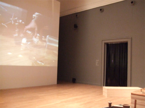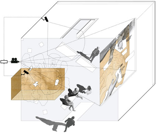 In the central room the visitor became part of a landscape of objects modelled at various scale and these became in turn part of the 1:1 world by a clever use of cameras and projections, which merged the visitors moving across the room and the visitors manipulating the modelled objects then projected onto the opposite wall. A playful and surprising installation exploring and engaging on how architecture and humans relate and work with each other.