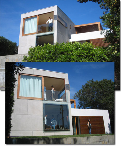 OK: everything leading up to this house today was a dry run. The Greenfield Residence is a house designed by the (mostly) Icelandic firm Minarc-Architects, and the principals of the firm live in it with their two infant children. The house is situated in a classical "temple on the mount" position, quite a few feet above the semi-suburban streetscape of Mar Vista. We took a couple of pictures from the street, then walked straight into the security guard who had the pleasure of informing us that no photography was allowed. DISASTER! We had been looking forward to this impeccably designed green residence,