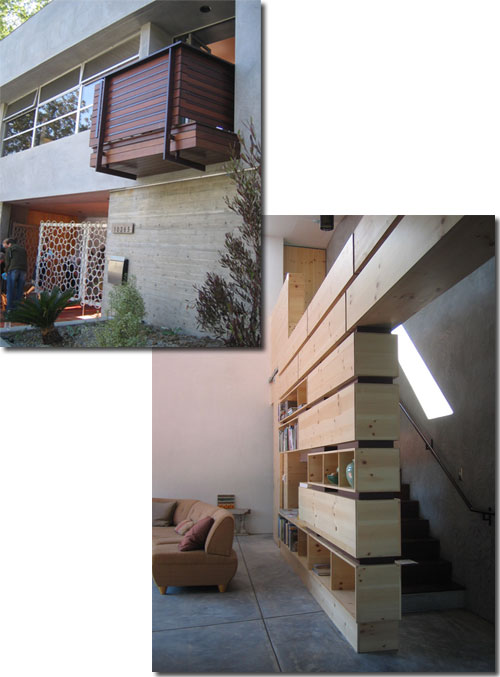 Minarc was a hard act to follow. The effortless green grace of the Greenfield Residence stood in stark contrast with the obvious intellectual effort displayed in the Courtyard House. A very awkward hillside lot with (I think) 15’ of height differential (could have been more, I forgot) in a very "quaint" neighborhood serves as the site for this complicated yet very intriguing structure. Tom told us that the owner requested a house that should resemble a loft, while offering lots of nooks and crannies for art and collections of this and that, and that it should fit into its surroundings and not clash too much with the Cape Cods and Mediterranean mansions across the street... Add green ambitions and very sculptural design ideas that Ripple Design had in mind, and you get the Courtyard House.