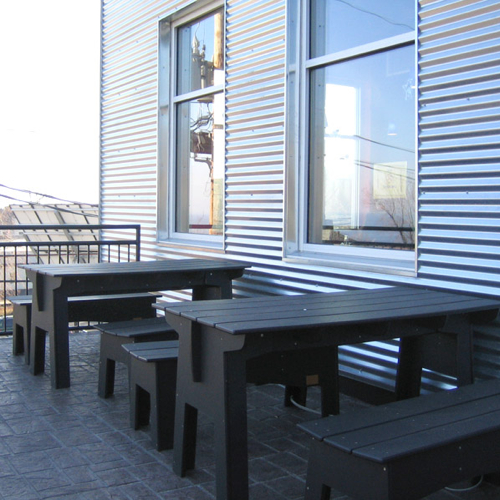 Thanks to a comment from Matt in our post below, we were clued-in to Loll Design, the firm behind the Room & Board Adirondack chairs. Turns out they've got quite an assortment of products, from chairs and stools to benches and tables, all made from 100% post-consumer high-density polyethylene. They also work close with designers and architects, collaborating on numerous projects, including The Octagon in NYC (above right) and designing benches for the St. Louis County Courthouse.