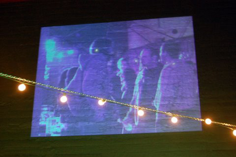Outdoors, people relaxed under space heaters glancing up at the huge projection screen that rotated work including Willet Moss, founder of CMG Landscape Architecture, a silent film by recent graduates, Astrid Diehl and Rusty Lamer, and an animated landscape by Adam Cruces.